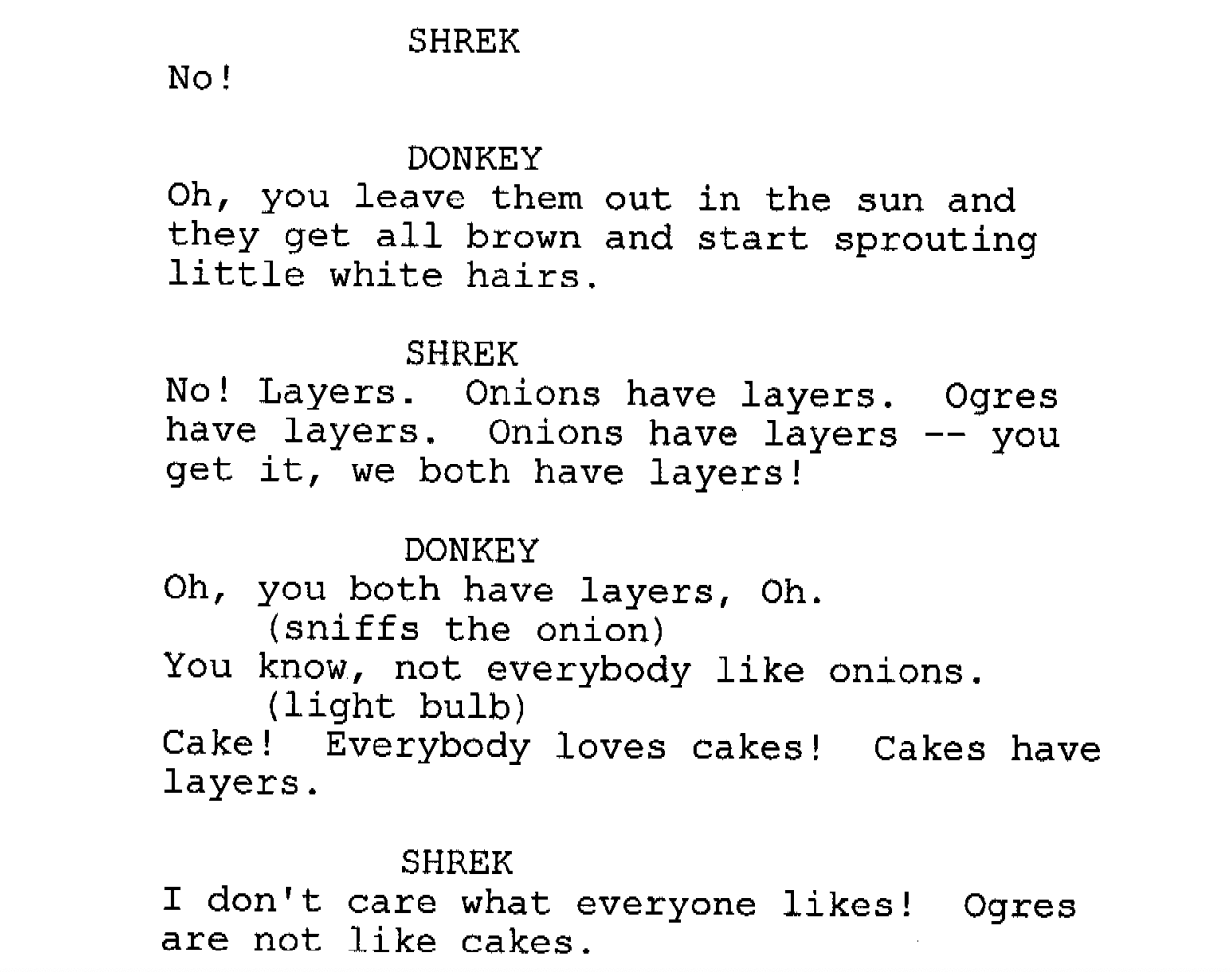 It wouldn’t feel right if Shrek said “There’s a lot more to ME than people think or “I have layers.” Onions are a perfect stand-in. This is great metaphoric subtext as we’ll talk about below when looking at Sideways.
